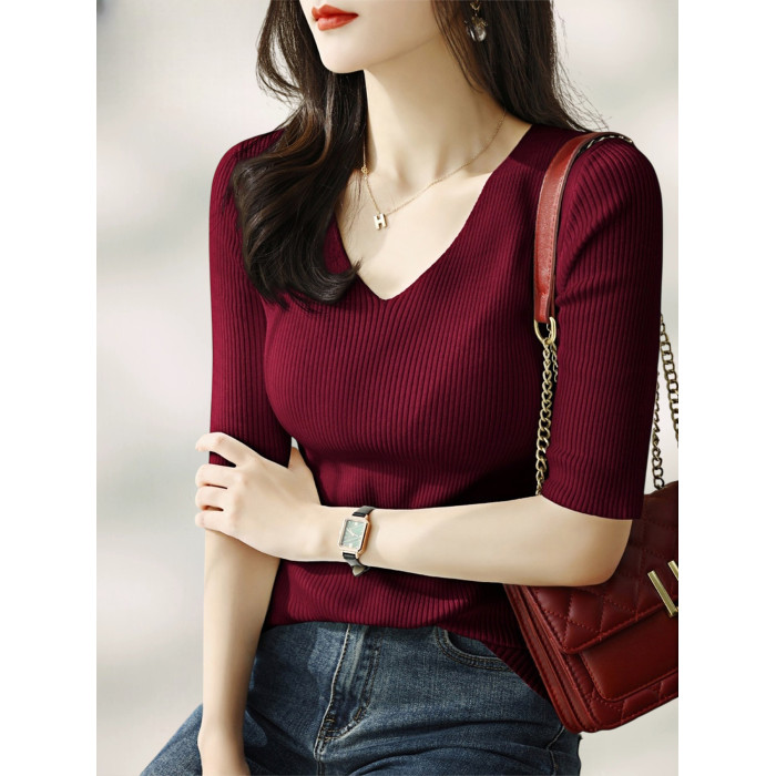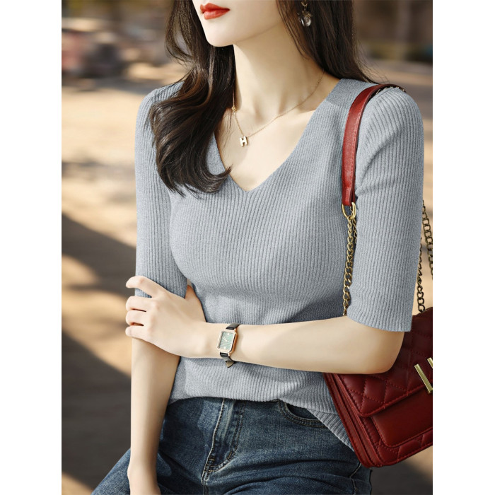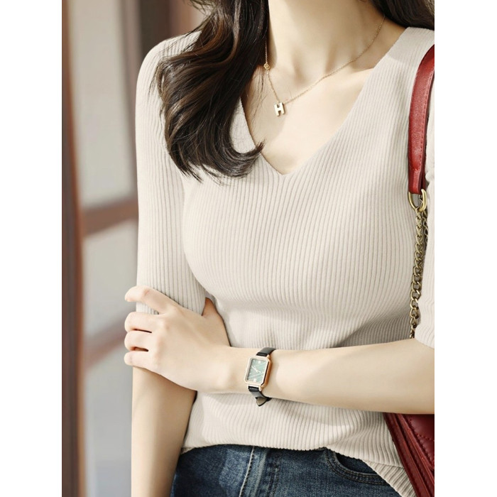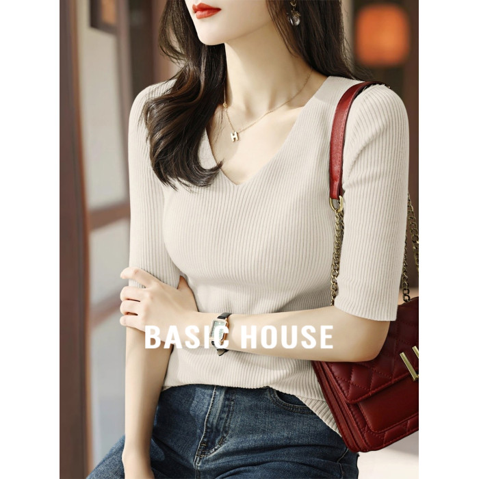 Basic House/百家好高級V領針織打底衫女2025夏季新款五分袖上衣