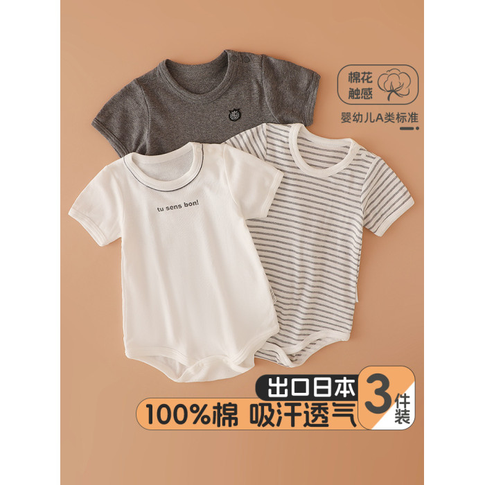 3件裝嬰兒短袖連體衣夏季透氣爬服新生兒男寶寶純棉薄款包屁衣A類