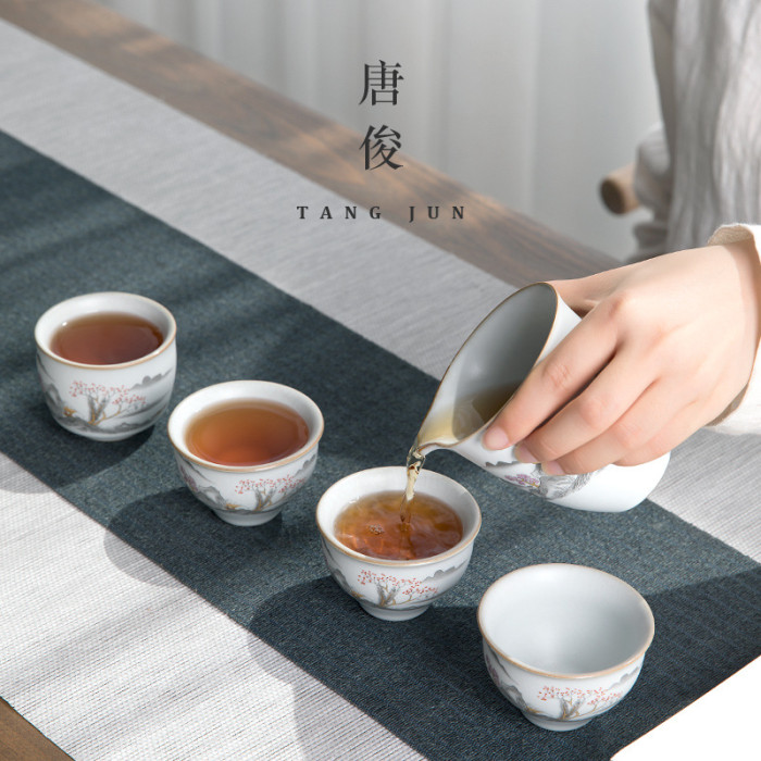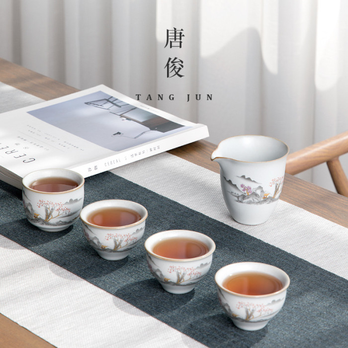 四方亭 景德鎮月白汝窰公道杯茶漏套裝一體茶海勻杯過濾中式茶具