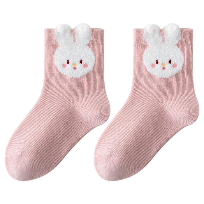 caramella女童襪子春秋純棉兒童女孩寶寶秋季粉色小兔卡通中筒襪